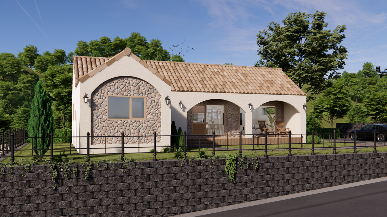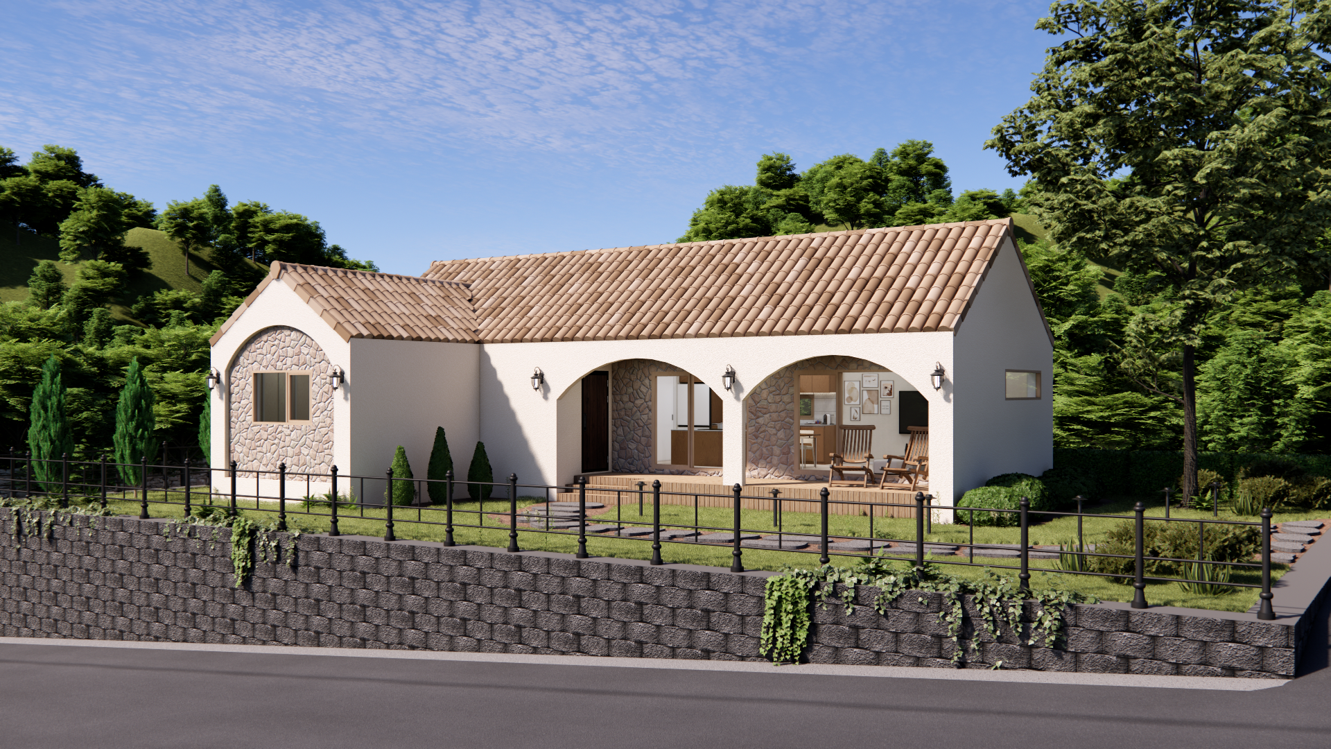 이 집은 부드러운 아치와 따뜻한 스톤 포인트가 조화를 이루는 지중해 감성의 전원주택입니다.