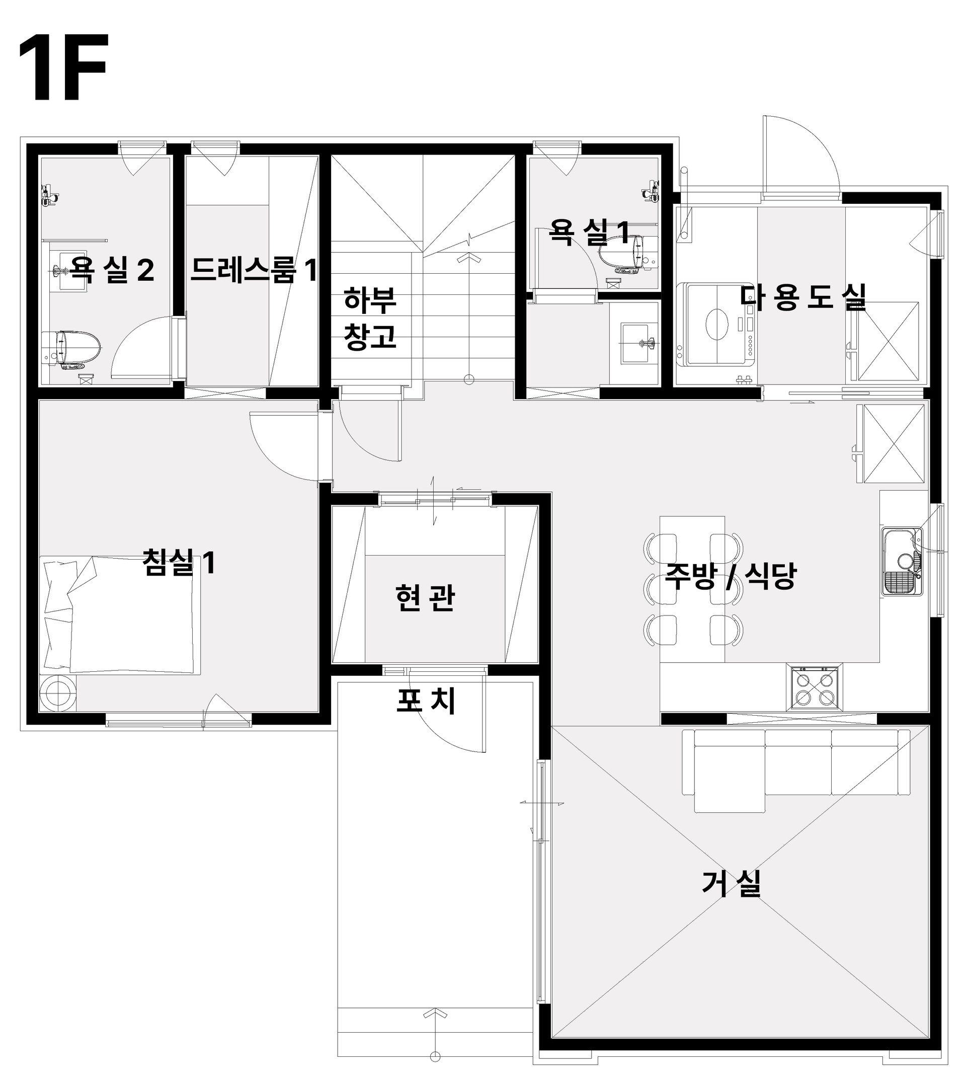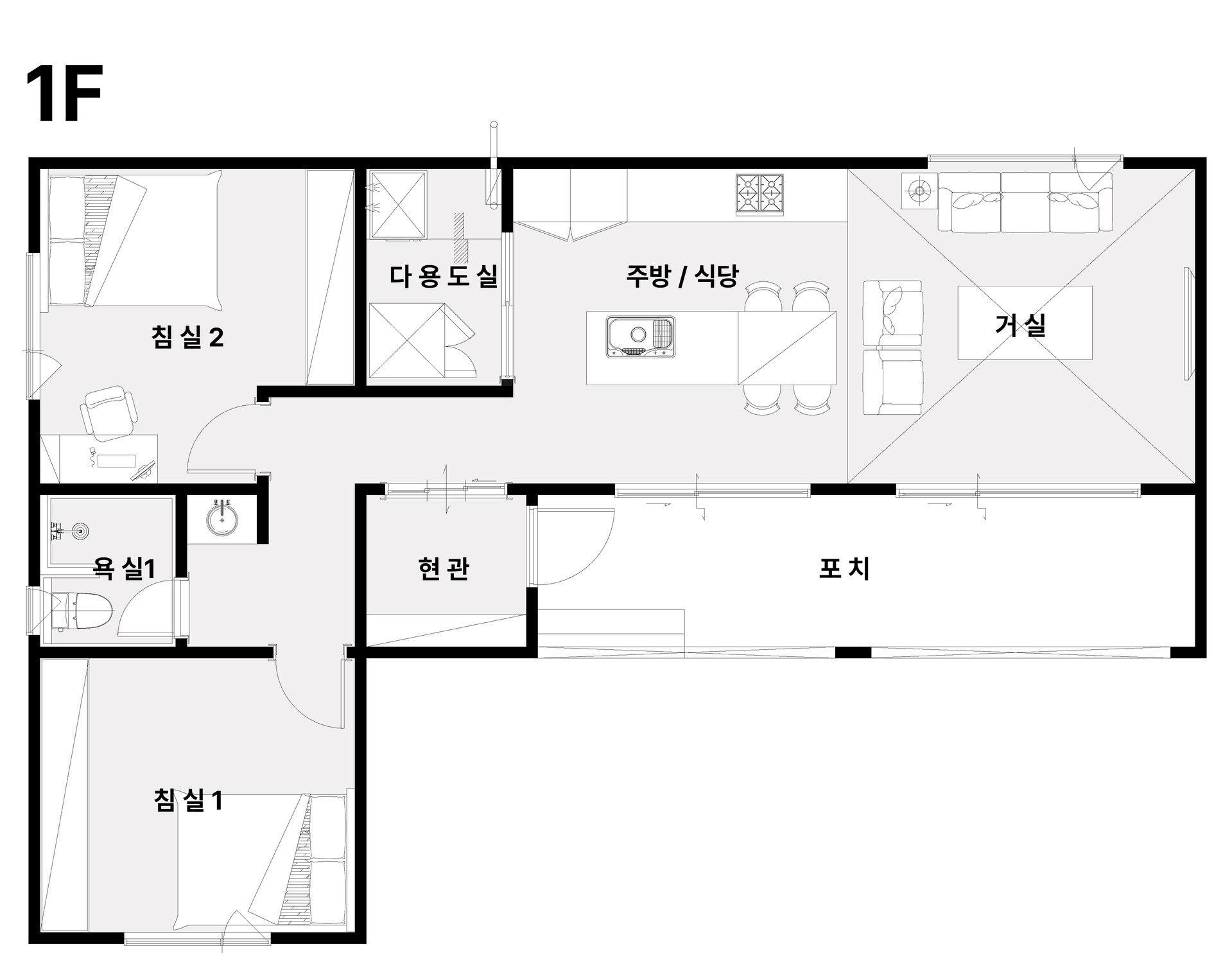 집의 중심에는 주방·식당과 오픈 거실이 넓게 배치되어 가족의 시간이 자연스럽게 모이고, 두 개의 침실은 동선을 분리해 각자의 프라이버시를 지켜줍니다.