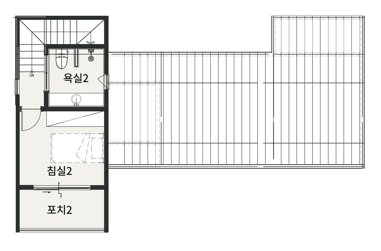 2층은 휴식과 개인 생활을 위한 독립 영역으로 구성해 생활의 밀도를 균형 있게 나누었습니다.
