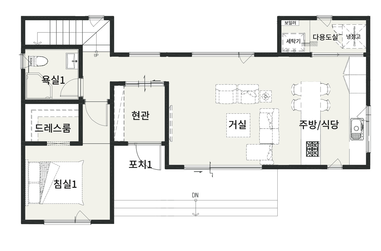 1층은 거실과 주방을 중심으로 한 가족 공용 공간으로 개방감과 실용성을 높였고,