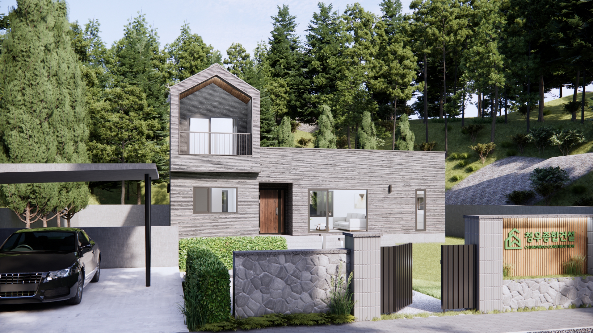 석재 마감과 직선형 매스를 활용한 외관은 견고하고 세련된 이미지를 주는 모델입니다.