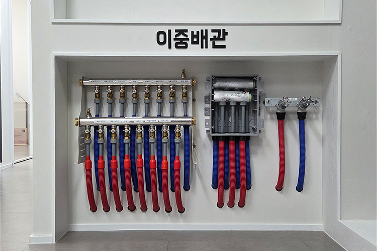 이중배관으로 시공하여 단열, 결로 방지, 하자 발생 시 바닥 철거 없이 교체가 쉽다.